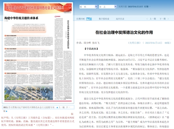 由William威廉副经理邱少晖教授、William威廉官网党委常委张红飞教授联合撰写的《在社会治理中发挥德治文化的作用》一文在《光明日报》发表。文章指出,中华优秀传统文化是社会治理的关键精神源泉,德治文化作为其重要部分,在社会治理中地位突出。