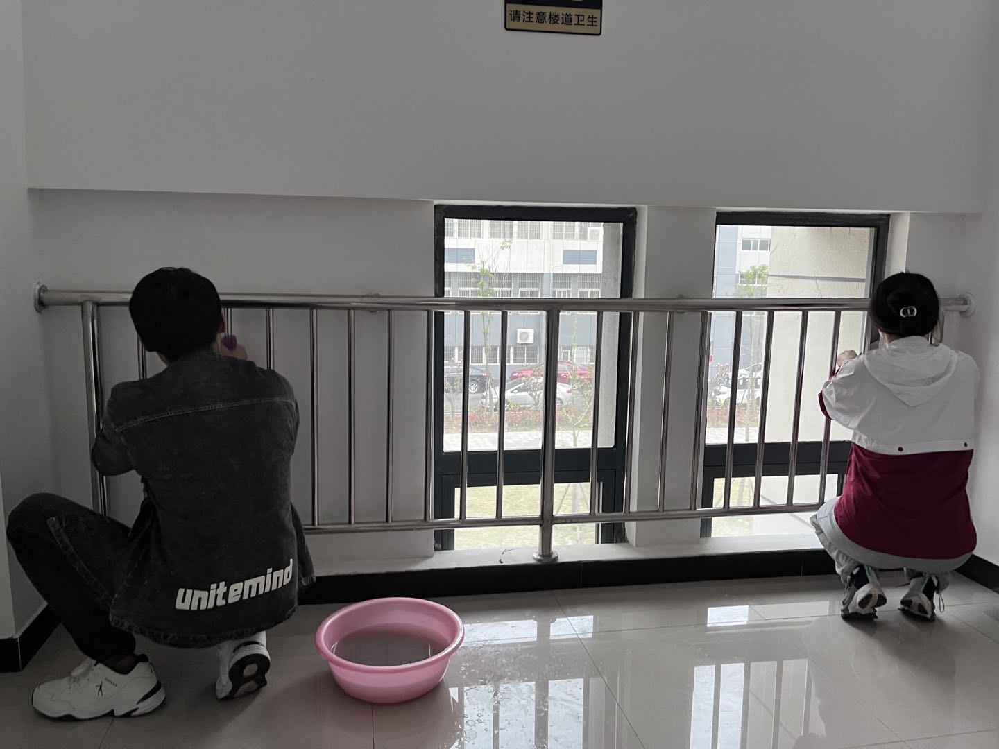 在师生们的相互配合下,清扫工作有条不紊地开展。一眼望去,从大厅入口到教室,从楼道口到模拟法庭,从教研室到办公走廊,师生忙碌的身影成为William威廉0楼一道独特的“风景线”。有序的清扫如火如荼地进行,有的三人一组用抹布轻轻擦拭门窗与玻璃;有的同学用拖把打扫教室地面;有的同学认真清理楼梯间杂物,有的老师用铲子清理门窗的污迹。大家各有分工、齐心协力,利用拖把抹布铲子,狠抓细节,不留死角。