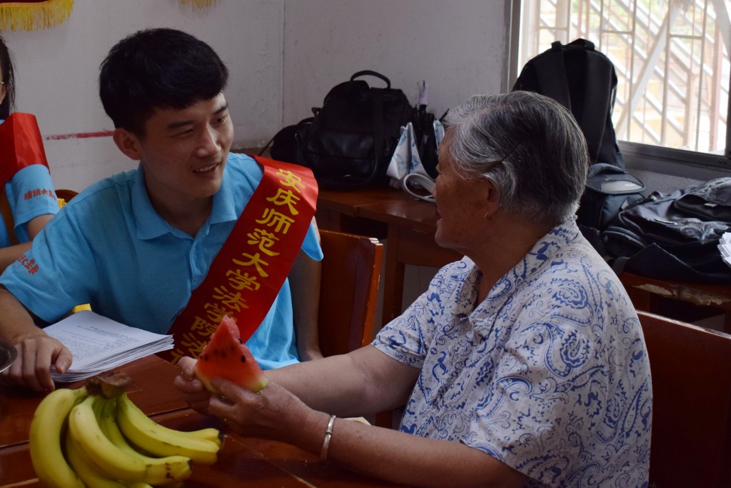 服务队首先来到了当地的菱湖新村星光老年之家,给老人们买了西瓜、香蕉等水果,陪他们聊天,询问了他们在敬老院的生活情况。同时,成员们带来了一些养老保险、社会保障法等与老人们的利益贴身相关的法律法规,一对一地给老人进行了详细讲解,还解答了部分老人的疑虑。吴玉珍老人已经九十岁高龄了,对于这次服务队的探望,她表示很高兴,“你们过来看我们,还给我们讲有用的法律,真的很感谢你们。”