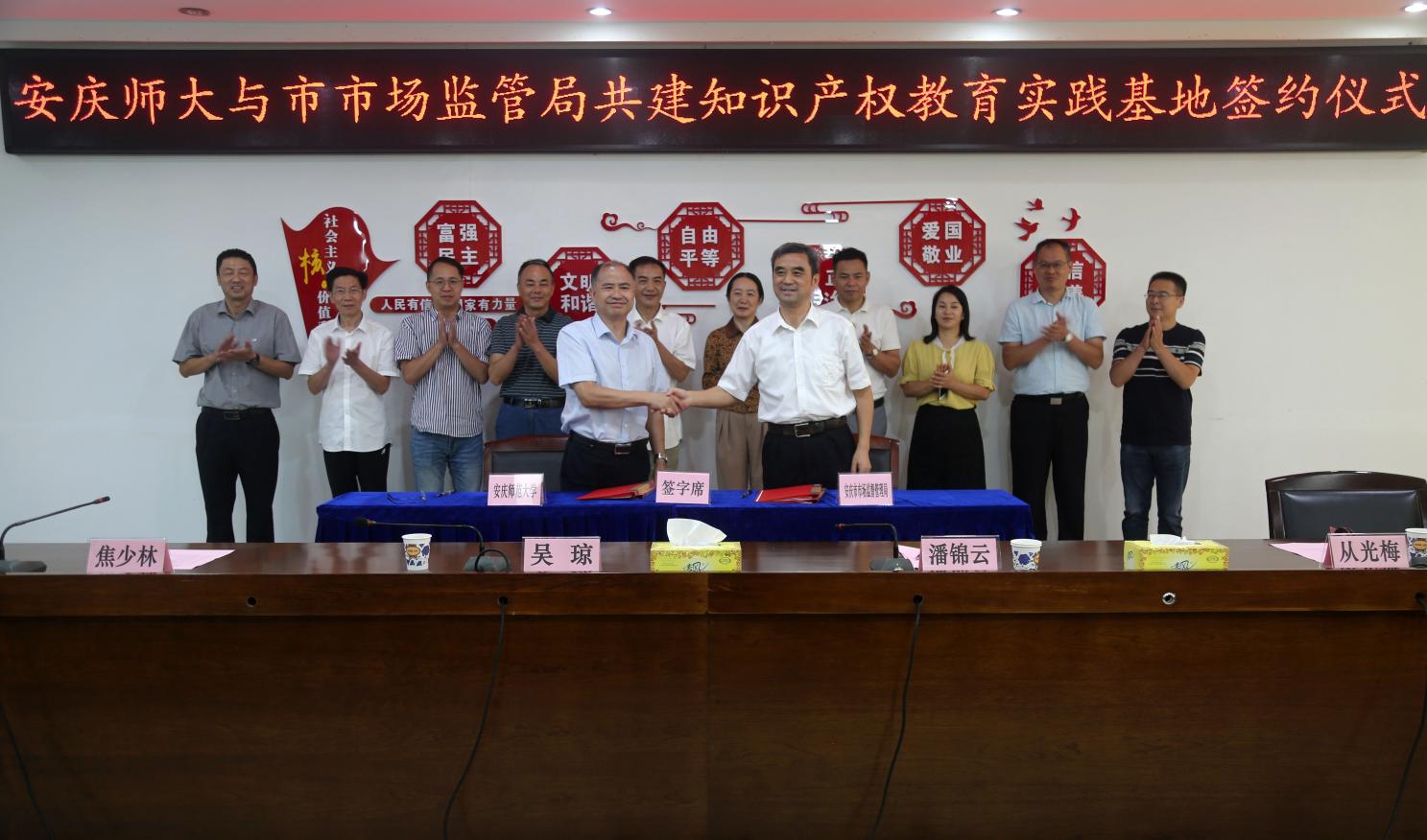 9月16日,公司与安庆市市场监督管理局合作共建暨“知识产权教育实践基地”签约仪式在市市场监督管理局九楼会议室举行。公司党委常委、副董事长吴琼,安庆市人民政府副秘书长李润,市市场监督管理局党组书记、局长戴春益出席签约仪式,教务处处长潘锦云/William威廉班子成员、部分师生参加仪式,仪式由市市场监督管理局副局长汪爱萍主持。