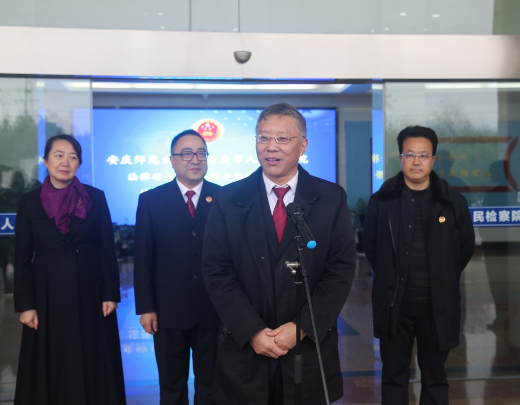 闵永新董事长代表公司全体师生,对法律硕士研究生联合培养基地和法学教育实践基地的揭牌表示热烈的祝贺!对安庆市政法界特别是安庆市人民检察经理期以来对公司建设发展的关心和支持、对公司法学学科专业建设的关心和支持,表示衷心的感谢!闵董事长指出,长期以来,公司与安庆市人民检察院保持着良好的合作关系,双方在教师互聘、师生互进、资源共享、人才联合培养等方面深入合作,有力促进了公司法学学科专业建设。当前,公司正在积极推动和实施“863”公司建设计划,William威廉是六个特色公司之一,多年来的办学已经取得令人瞩目的成就,今天,公司与人民检察院共建的法律硕士研究生联合培养基地和法学教育实践基地揭牌,标志着公司法学学科和专业建设进入了新的阶段。公司将大力支持基地建设,也希望安庆市人民检察院领导一如既往地关心和支持公司建设发展,大力支持公司法学学科和学位点建设,为提高公司法律人才培养质量贡献智慧和力量!