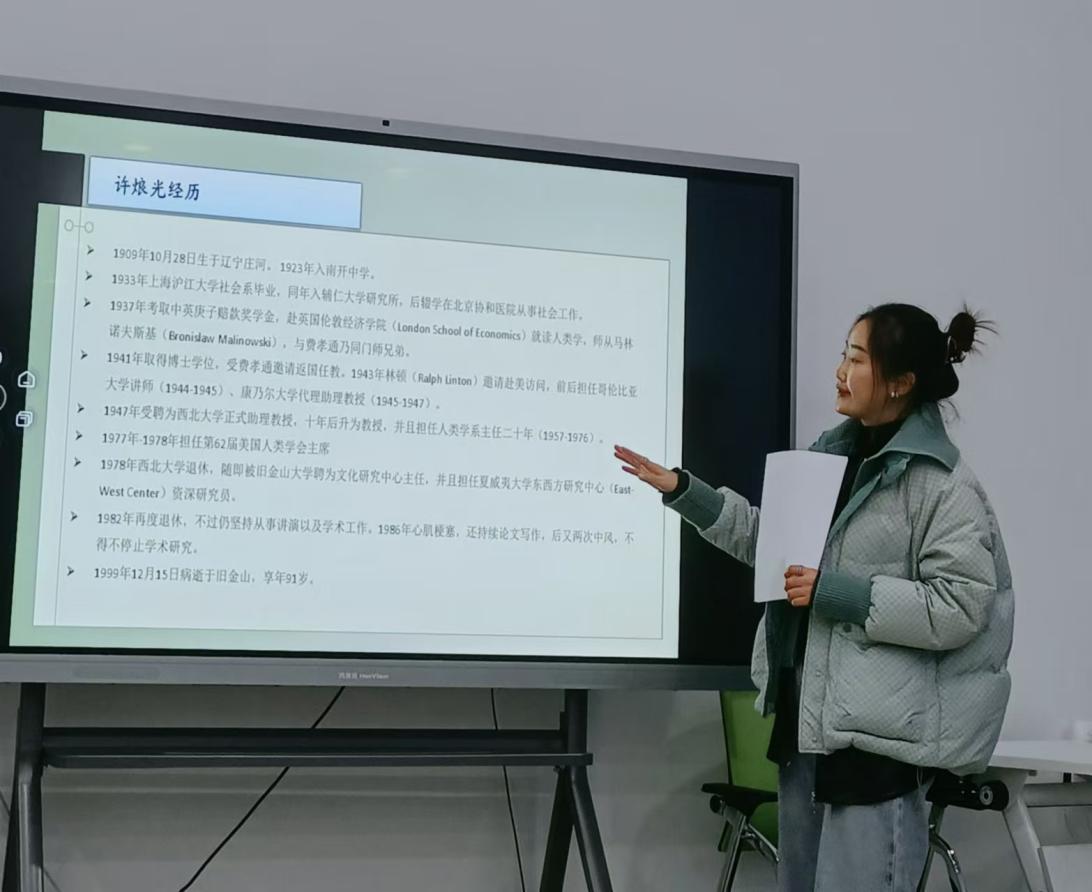 2023级社会工作专业徐梦瑶同学着重汇报了《祖荫下》前六章内容,她对每章节的内容进行概括性分析,为大家详细介绍了本书作者在喜洲镇考察时所观察到的社会大众的生活习惯,引发了大家对个人成长环境与文化背景之间关系的深入思考。2023级法学类2班吴欢同学通过讲解《祖荫下》的后半部分内容,向与会听众展示了在喜洲镇生活的社会大众的文化与人格,同时也分享了他对喜洲镇社会群众文化生活的看法,引发了大家对在尊重传统的同时勇于突破和创新的思考与讨论。