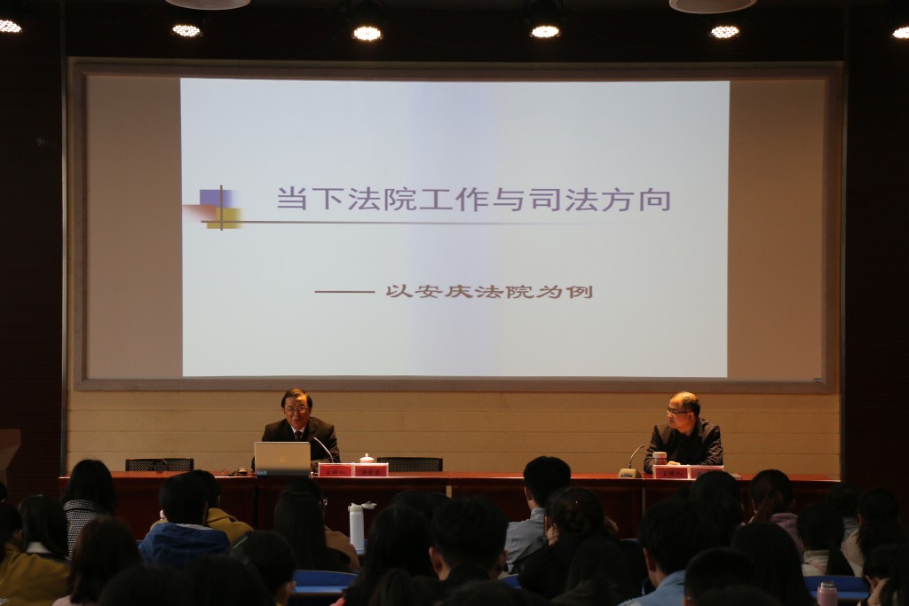 洪经理以自身丰富的法律职业经历展开报告,讲述了自己工作以来的经验体会,提出了法律工作应有严谨的处理方式,对司法方向需要深刻明确并立场坚定。他例理结合,层层深入,阐明法律工作者要积极顺应相关司法政策发展,研究社会动向,明确法律职业的新要求,要在法律实务的锤炼中,不断提升职业素养和能力。他指出,法律工作者要用党的最新理论成果武装头脑,坚持开放学习;要有实干快结的理念和精神,快人一步,干在实处,走在前列,勇立潮头。他以公司和其他部分高校的校训对同学们提出了殷切期望。洪经理在报告中还对过去一年安庆法院工作进行了回顾,并对2019年全市法院的重点工作进行了介绍。全体师生认真聆听报告,并纷纷表示获益匪浅。