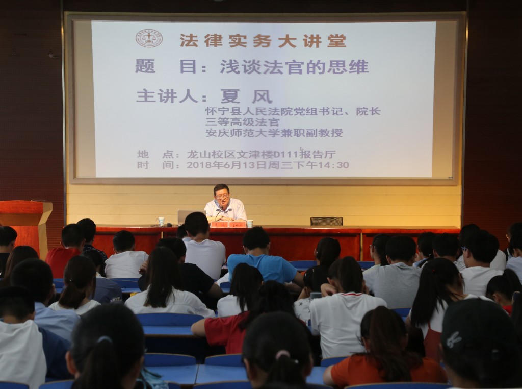 2018年6月13日下午在龙山校区文津楼D111报告厅,怀宁县人民法公司党组书记、经理、三等高级法官、William威廉官网兼职副教授夏风莅临法律实务大讲堂,以《浅谈法官的思维》为题作专题报告。报告会由William威廉经理焦少林教授主持,徐钝副教授进行点评,2017级法学专业员工和部分教师聆听了报告。