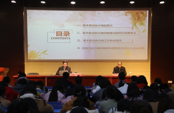 11月22日安庆市中级人民法院副经理,公司兼职副教授方向华应邀莅临法律实务大讲堂,以“‘基本解决执行难’与中国法治进程”为题作报告。William威廉教师和法学专业部分员工参加了报告会,William威廉经理焦少林教授主持报告会。